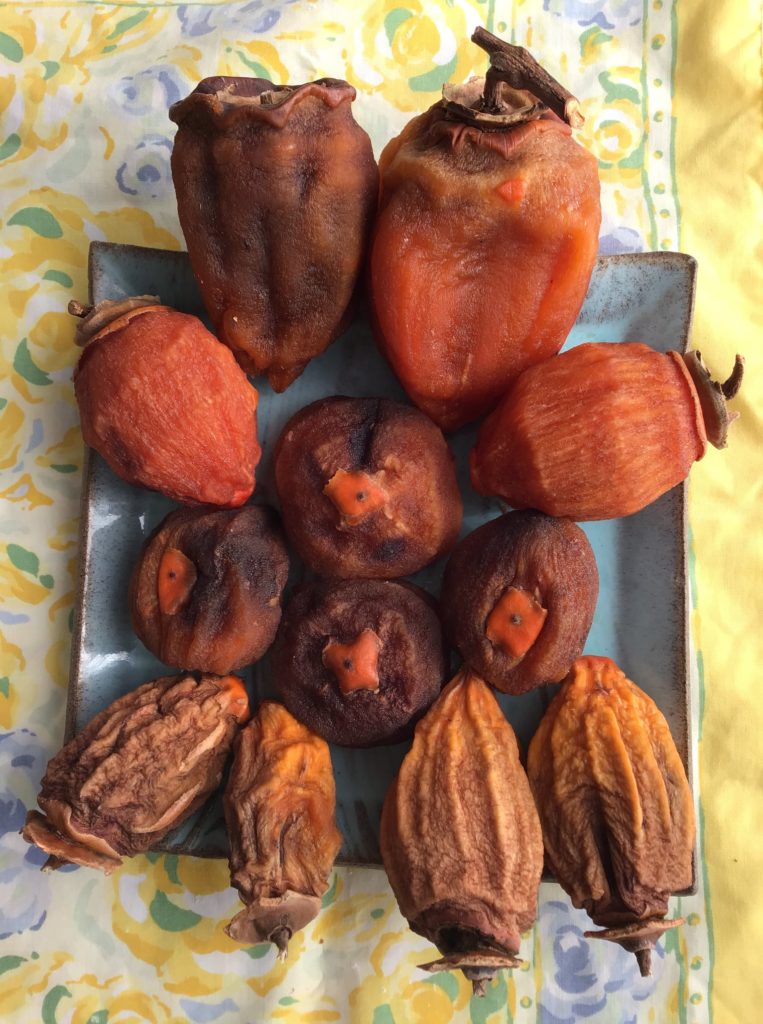 真ん中の丸い4つは庄内柿。枝がついてなくて吊るせず、平干しにしました。期待していませんでしたが、これがシュークリームみたいに口の中で溶けて甘く、なかなかの出来栄えとなりました。